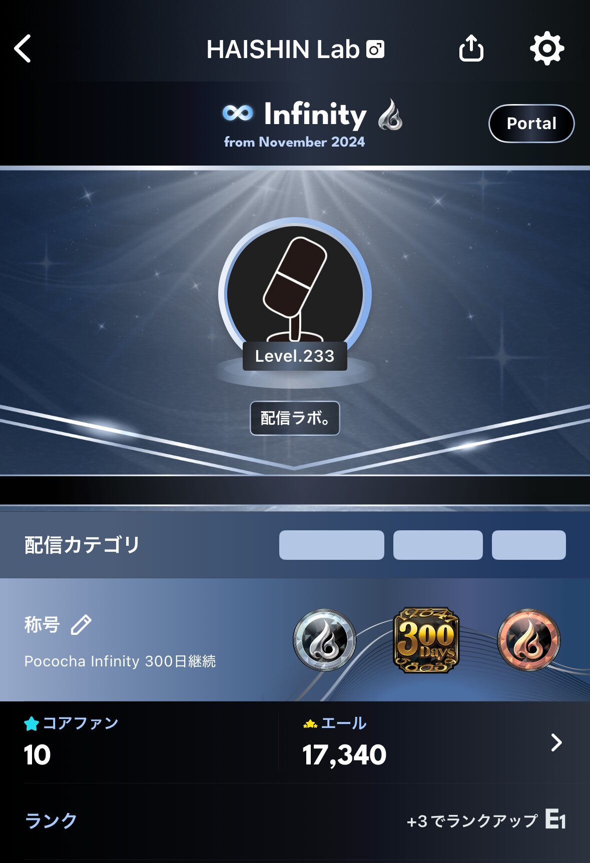 応援しているライバーごとのコアファンエール級をまとめて確認できるInfinityリスナー限定の機能です。