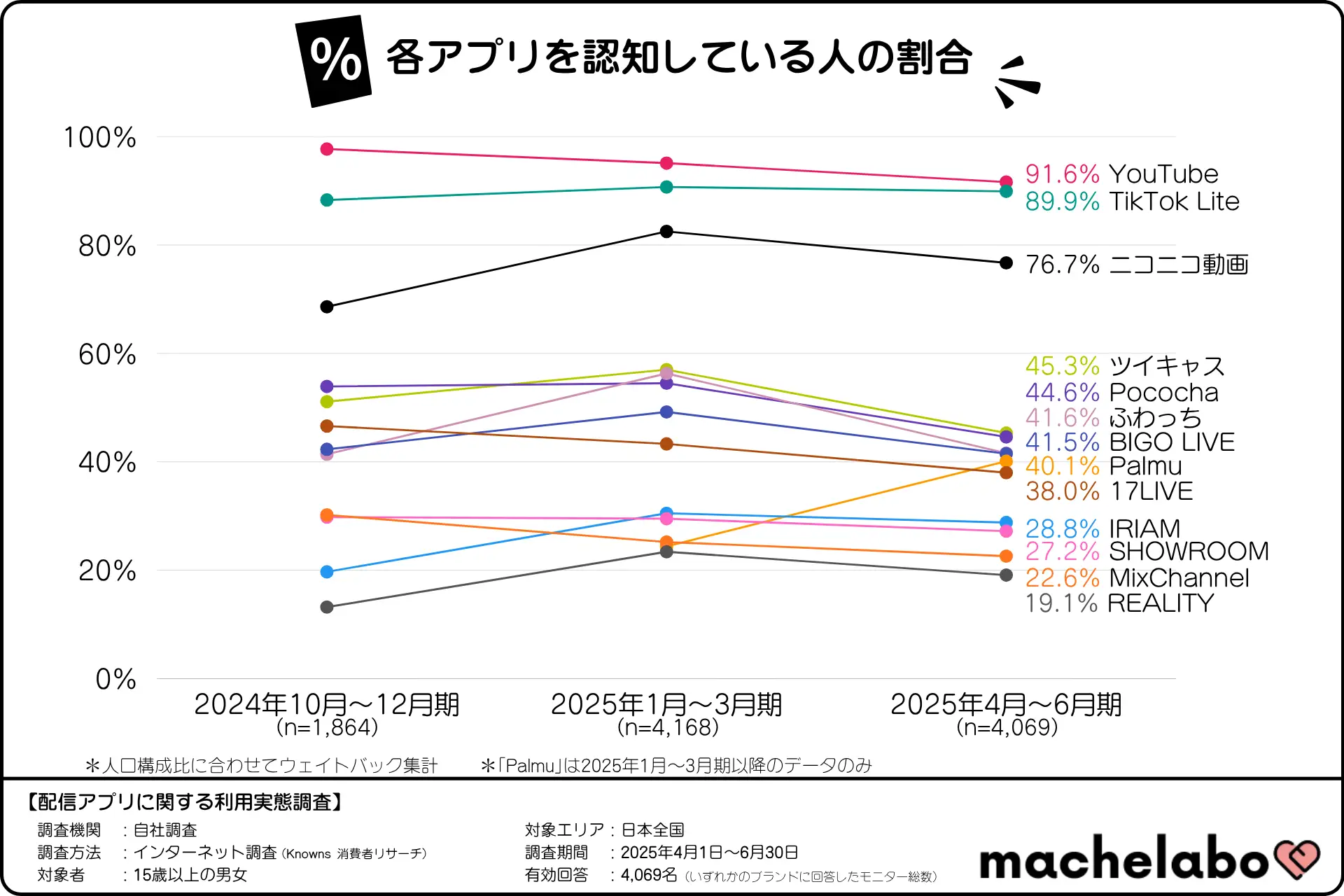 2025年4月~6月期の調査では、「YouTube」の認知率が91.6%に達し、トップを維持しました。これに「TikTok Lite」が89.9%と僅差で続き、この2つの動画プラットフォームが他を大きく引き離す結果となっています。3位は「ニコニコ動画」で76.7%でした。