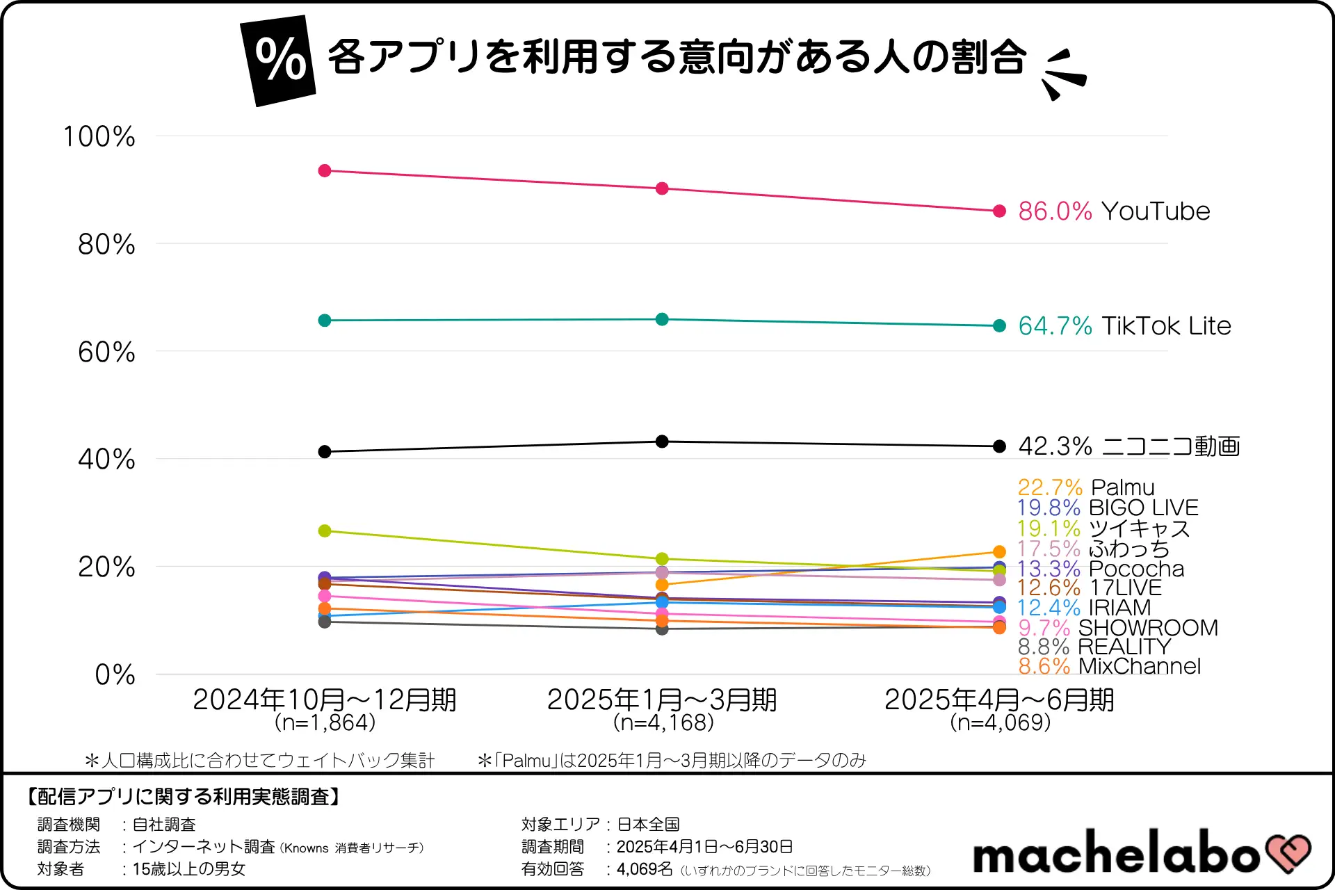 2025年4月~6月期の調査において、「今後、利用したい」という意向が最も高かったのは「YouTube」で86.0%でした。これに「TikTok Lite」が64.7%、「ニコニコ動画」が42.3%で続いており、認知率と同じように上位3サービスが4位以下を大きく引き離す結果となっています。