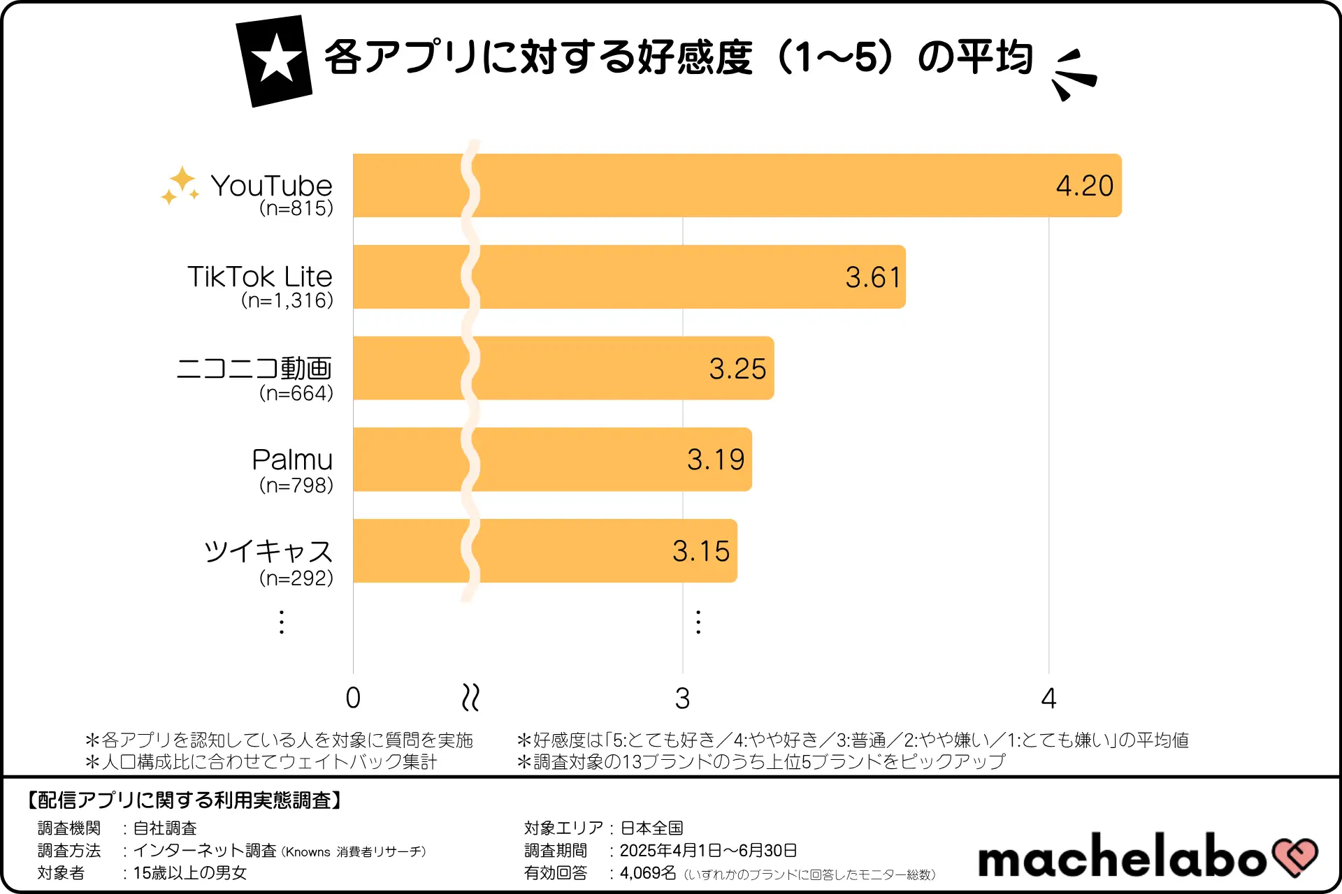 2025年4月~6月期の調査では、好感度が最も高かったのは「YouTube」で平均4.20と極めて高い評価を得ました。これに「TikTok Lite」が3.61で続いています。