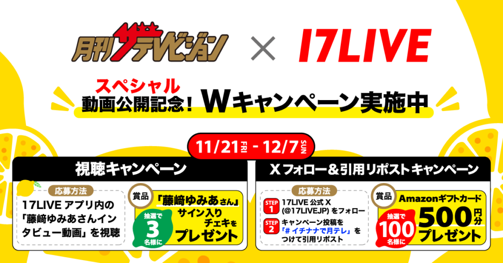 17LIVEと月刊ザテレビジョンのコラボ企画第二弾は、藤﨑ゆみあさんのインタビュー動画公開と2つのキャンペーンで構成されています。視聴するだけで応募できるキャンペーンとXでの引用リポストキャンペーン、どちらも参加しやすい内容となっています。